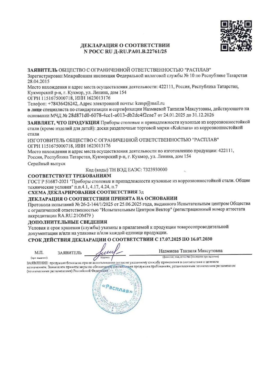 Декларация на посуду из нержавеющей стали ООО Расплав